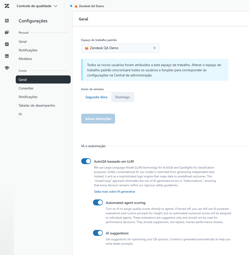 Alteração do Espaço de Trabalho Padrão no Zendesk QA