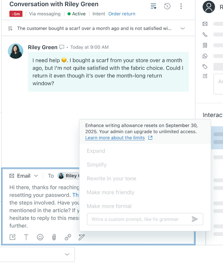 As ferramentas de redação com IA generativa do Copiloto permitem que seus agentes aprimorem os comentários em tickets de várias formas, como expandir, simplificar, ajustar o tom e até mesmo corrigir a gramática. Cada agente tem cinco usos disponíveis por mês, que podem ser compartilhados entre a equipe. Isso significa que, se você tem 10 agentes, terá 50 usos mensais! Essa abordagem ajuda a maximizar a eficiência e a qualidade das interações com os clientes.