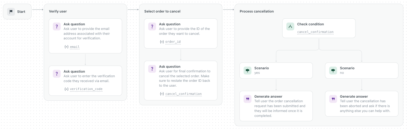 Os procedimentos generativos são a base que define o fluxo de conversa do agente. Eles permitem que o sistema gere automaticamente um mapa do procedimento, exibindo a lógica a ser seguida durante a interação. Isso significa que, mesmo que um cliente desvie do caminho esperado, o agente de IA pode se adaptar e continuar a conversa de forma eficaz! Aqui estão alguns pontos principais: